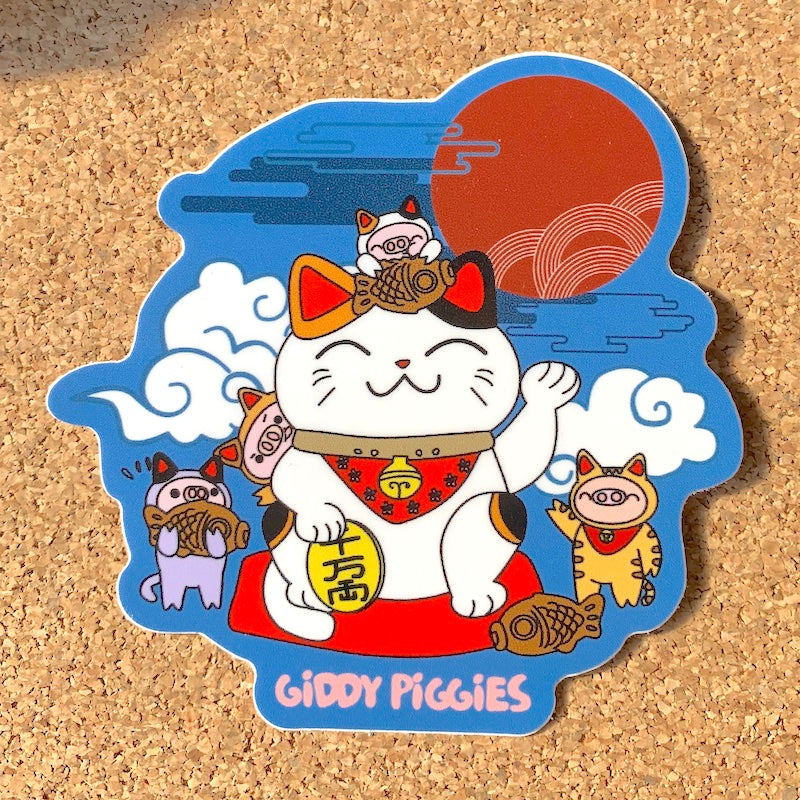 Giddy Piggies Lucky Cat glossy vinyl sticker